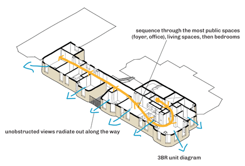 With height concentrated on the southern corners and northern edge of the typical block, shade in the block back yard is minimized. We studied an 8-story 85’ building as a density bonus project on to the 65’ referenced in the brief. We are proposing 50% of the units will be affordable. The deep levels of affordability would be cross-subsidized by a 4BR 2,500 sq ft home on the top floors. We are proposing a mass timber structure, construction Type IV-C with concrete and steel at the elevator and stair core.